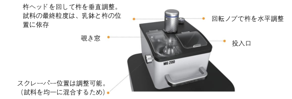 | 乳鉢・乳棒材質 | ステンレス鋼、硬化鋼、タングステンカーバイド、めのう、焼結酸化アルミナ、酸化ジルコニア | ||||||