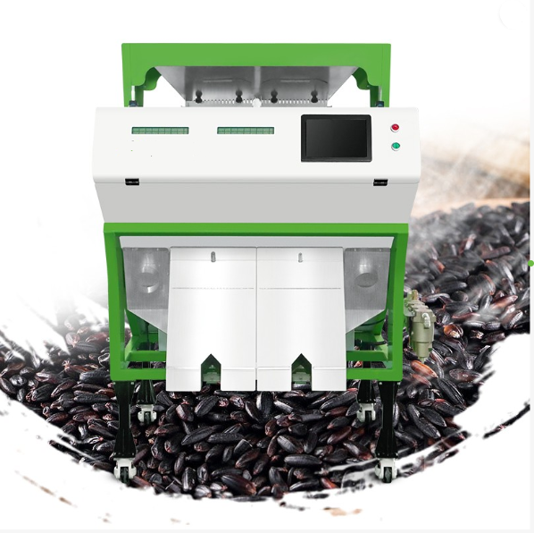 フルカラーカメラで原料の中から着色物・異物などの不良品を圧縮空気で除去する装置。